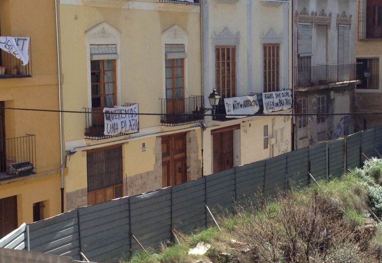 Desenes de pancartes denunciant aquesta penosa situació de les restes arqueològiques i l’extrema condició de degradació en què es troben pengen dels balcons dels veïns des de fa algunes setmanes, sense que ni l’ajuntament de Rita Barberà ni la Generalitat d’Alberto Fabra, en una coresponsabilitat compartida dels fets, es dignen a posar fi a aquesta situació.