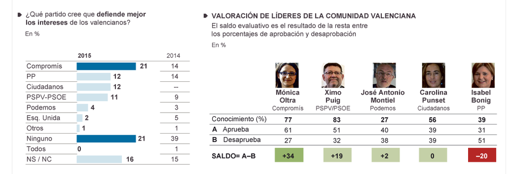 Com a últimes dades que subratllarem, farem menció d’un detall que sorprén de l’enquesta dels diaris valencians. I és que, a l’hora d’inquirir per la valoració dels candidats de cada partit, no sabem per què no van incloure Baldoví en el qüestionari. I, també, esmentarem una dada que, en les últimes conteses, s’ha mostrat decisiva: el baròmetre d’El País sempre pregunta per quin partit defén millor els interessos valencians. Abans de maig, Compromís liderava este rànquing, empatat amb el PP, amb un 14% sobre cens. Ara, este percentatge s’ha elevat fins al 21. És creïble que no signifique res?