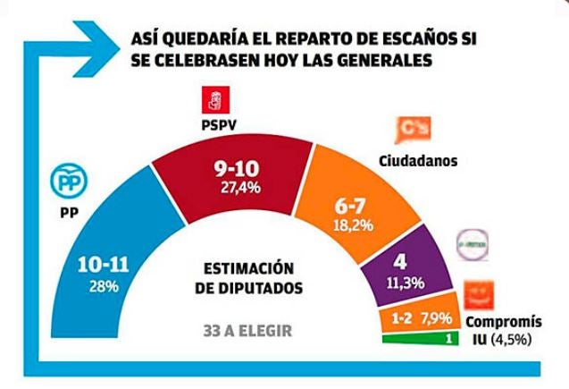 La segona interpretació és saber on anirien els vots teòricament perduts de Compromís. I, malgrat el que es puga pressuposar, segons estes enquestes, no seria a Podemos. De fet, en la de Levante, P’s obté un percentatge idèntic que en autonòmiques. Què implicaria això? Implicaria que Compromís distribuiria entre PP, PSOE i C’s onze punts dels díhuit obtinguts en autonòmiques. És a dir, el votant regionalista valencià que va elegir Compromís al maig estaria tornant al PP, el d’esquerra moderada al PSOE i el regenerador estaria sent seduït per C’s (que, afavorits per la brutal campanya mediàtica que ja els va impulsar en les eleccions catalanes del 27S, també beurien de les restes d’UPD). Probablement, a cap d’estos tres perfils de votant no els deu estimular especialment l’estira i arronsa d’un possible pacte entre Compromís i P’s, o això es desprén de les xifres.