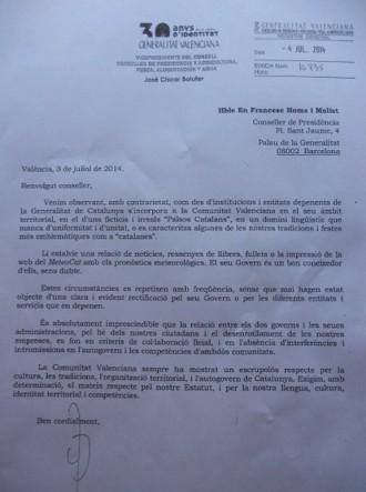 La carta exigia al Govern català “respecte” per l'”Estatut d’Autonomia i la llengua, cultura i identitat territorial” dels valencians i per les “competències” del seu autogovern.