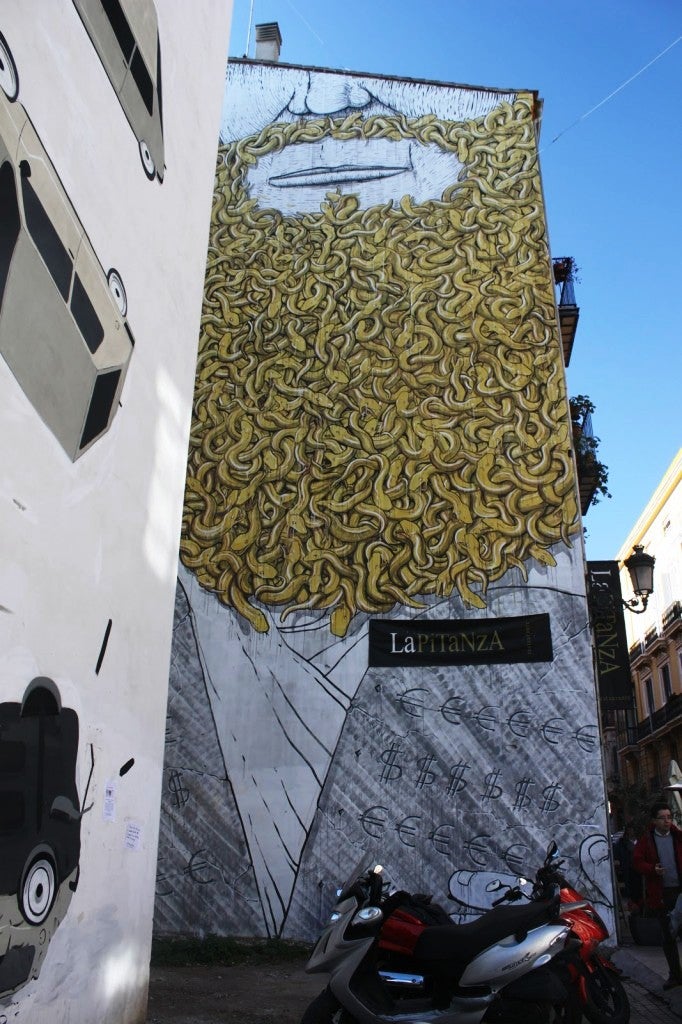 Éssers híbrids amb cos humà i cap d’au, insiders, éssers misteriosos en escenes que denuncien la societat consumista actual o els abusos del capitalisme i del poder, animals gegantins que ocupen façanes senceres d’edificis, xiquetes de trets orientals de grans ulls tancats amb grans colorits i sovint amb missatges ecològics, llimons, botifarres gegants vivents … Tot un torrent de vida, de colorit, de formes geomètriques, d’art, d’expressivitat i de creativitat que al llarg de més de dues hores vaig recollir amb la meua càmera i que ara mostre en part en aquest apunt.