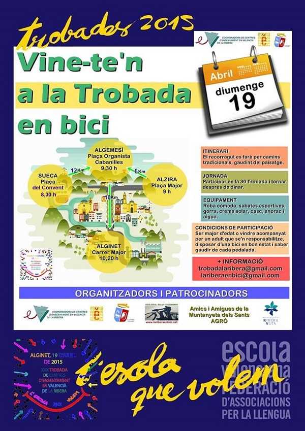En eixe sentit, la Ribera en Bici i els Amics de la Muntanyeta ens afegim a aquesta celebració, conscienciació i reivindicació amb un passeig en bici, sense presses i quasi tot per camins rurals, cap a la XXX Trobada d’Escoles en Valencià de la Ribera, que enguany es celebra a Alginet, també aquest diumenge. És una feliç coincidència que ens permet practicar la simbiosis i la sinergia que ha d’existir entre la cultura i l’ecologia, dues qüestions imprescindibles per a resoldre els greus problemes que ens aclaparen hui i fiquen en perill el nostre futur.